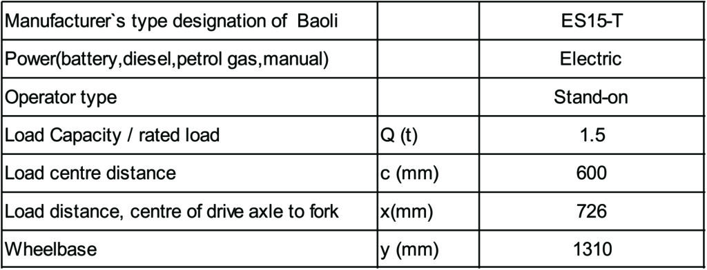 ELECTRIC WAREHOUSE TRUCK ES15-T Baoli ES15 stackers offer a safe, productive, and cost effective solution and improve efficiency in transporting over short distances and stacking or lifting up to 5000 mm. The compact chassis ensures easy and safe operation even in the most confined spaces. The combination of 3-phase AC drive motor and electronic controller ensures maximum